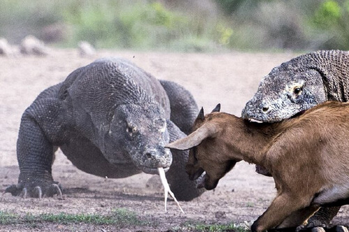 科莫多巨蜥非常凶猛,常捕食野猪、猴子、鹿、山羊等动物,不仅会吃成年同类及同类的幼崽,甚至还攻击人类、寻找人类的尸体为食!科莫多巨蜥拥有毒腺,唾液中有很多致命的病菌,这使得被科莫多巨蜥咬伤的猎物很快就会因中毒或病菌感染死去。曾有不少人因被科莫多龙袭击而死亡。